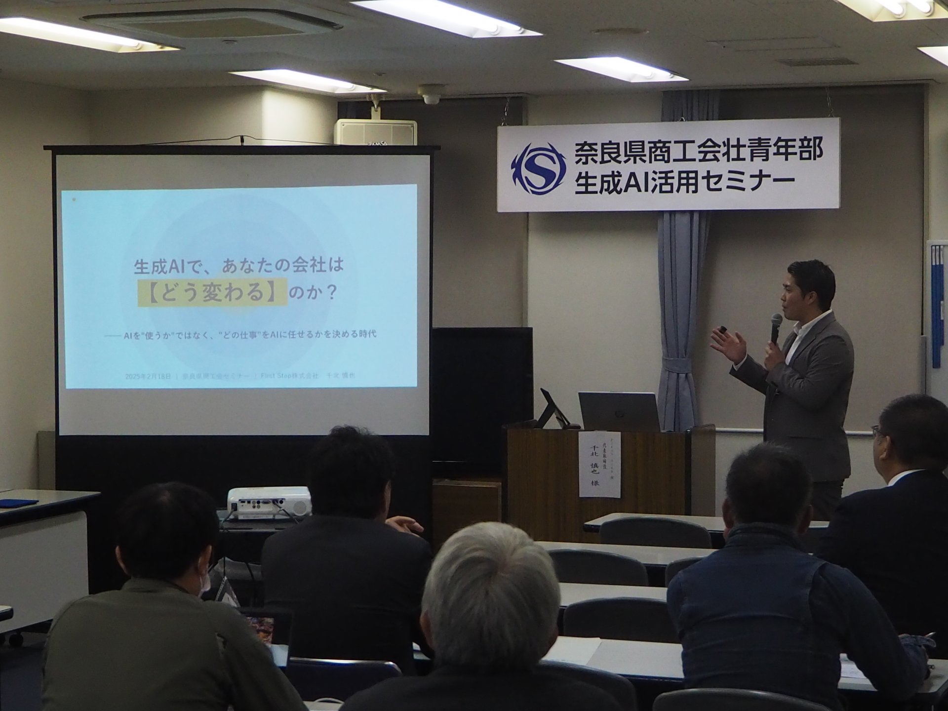 奈良県商工会壮青年部 生成AI活用セミナーを開催しました。当日はFirst Step㈱の千北 慎也氏をお招きし、生成AIの活用事例をデモを交えてご説明いただきました。参加者は約30名程で、生成AIを上手く活用することが出来れば、事業の幅が広がるということを身をもって知ることができた、大変有意義なセミナーとなりました。